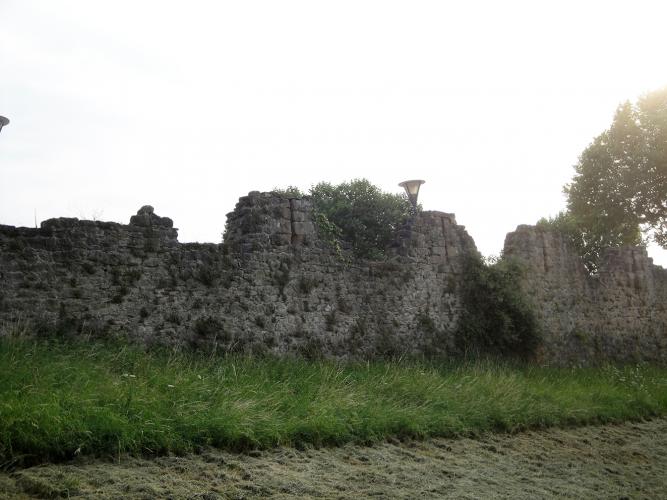 A la part de l'esplanada, on hi havia el jardí, tenim un porxo modern d'estil remordiment. El que és interessant son els dos escuts llaurats en pedra, l'un amb l'heràldica de la vila, amb quatre torres d'escacs, molt similars a les dels Rocabertí de l'Alt Empordà. I al costat, un en forma de pergamí on diu que la primera pedra fou posada per Pèire de Santa Colomba. Se diu que fou construída mercès de la poderosa economia dels drapers de la zona. Del castell resten alguns minsos panys de murs que tancaven el "castrum" que originàriament tenia quatre portals.