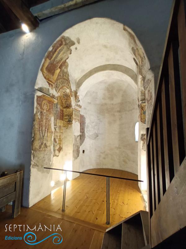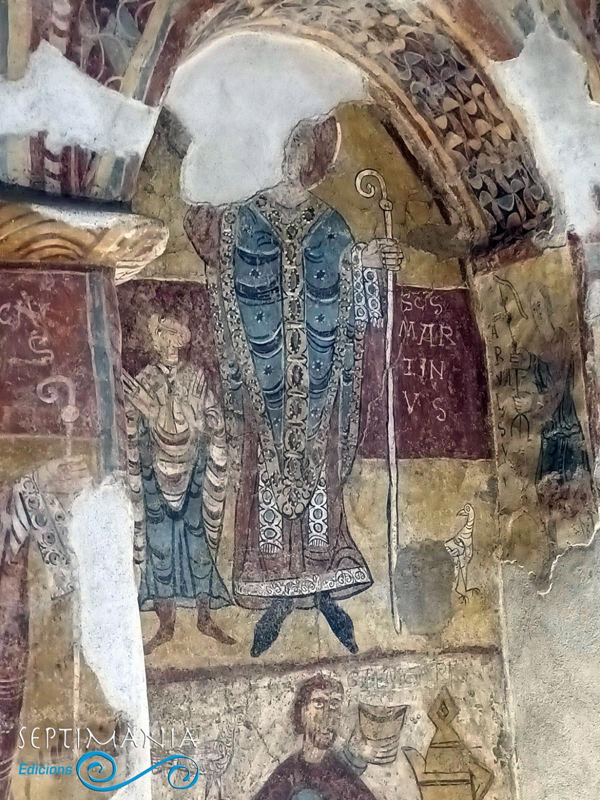 En aquestes pintures són ricament representats entre d'altres, el patró del temple i bisbe de Tours, Sant Martí, a l'interior de la fornícula de l'arc former i, a la seva dreta un clergue. A la l'esquerra de Sant Martí, al pilar de l'arc d'entrada de la capella, tenim un altre personatge eclesiàstic, Sant Brici amb la llegenda SCS BRICIUS, i que també té categoria de bisbe. A la part inferior dels dos personatges eclesiàstics, en veiem un de ben profà, assegut sobre un tamboret de tres potes. A ell se l'acompanya amb la llegenda GILEM GIFRED, que podria correspondre al nom del bisbe d'Urgell malgrat no anar representat com a tal, o bé algun noble que coincidís el nom. Aquest sosté un got, alguns hi veuen un graal, i amb l'altra mà, un ganivet amb el qual se suposa que, tot seguint la tradició de Sant Martí, acaba de tallar la capa. Al darrere seu i a l'altura del cap, un colom de color vermell. A l'intradós del pilar més proper a la nau, veiem la figura d'un personatge masculí, que dirigeix la mirada vers sant Martí i sosté un calze amb les mans cobertes amb un drap. Davant aquest, i també a l'intradós del pilar del davant, veiem un personatge que sosté un canelobre de tres peus i que presenta la llegenda de ARNALSU, altres autors hi veuen escrit ARYALSU. Alguns el relacionen amb el vescomte Arnau de Caboet i d'altres amb una cerimònia d'abjuració d'un càtar.